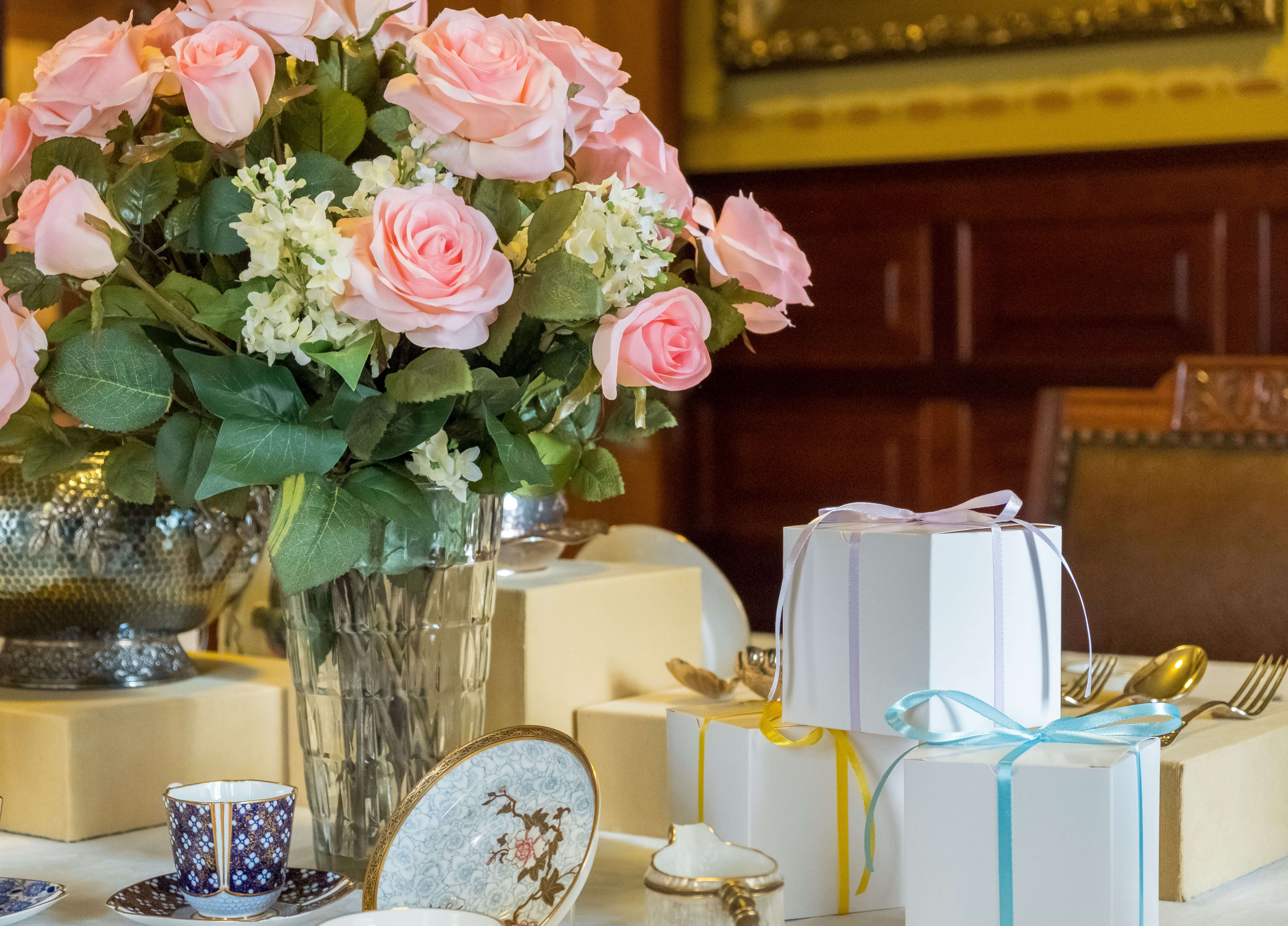 Objects relating to chocolates, cake, sweets, and bon bons are also on view in the dining room, including a chocolate service made by Dresden ceramics manufacturer Karl Richard Klemm decorated with courting couples in romantic settings in the style of Antoine Watteau and François Boucher.Installation views of Clayton Dining Room.